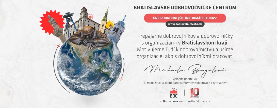 Bratislavské dobrovoľnícke centrum je občianske združenie, ktoré od roku 2012 prepája dobrovoľníkov a dobrovoľníčky s organizáciami nielen v Bratislave, ale v celom Bratislavskom kraji. Motivujú ľudí k dobrovoľníctvu a učia iné organizácie, ako s dobrovoľníkmi pracovať.